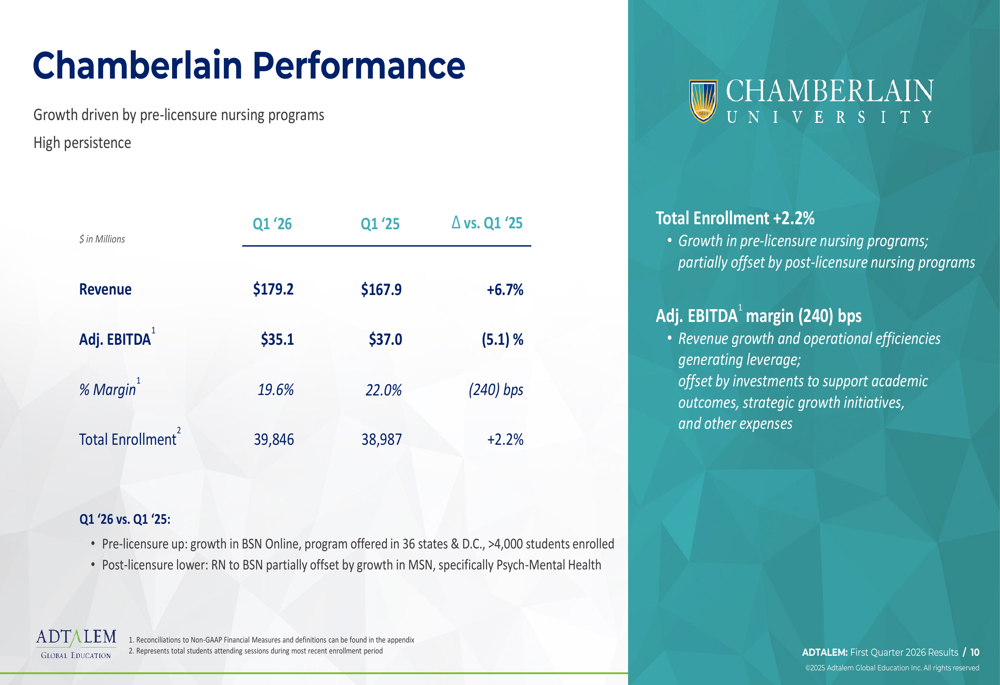 Chamberlain University, which focuses on nursing education, reported a 6.7% revenue increase to $179.2 million, though its adjusted EBITDA decreased by 5.1% to $35.1 million. Total enrollment grew by 2.2% year-over-year to 39,846 students, marking the eleventh straight quarter of enrollment growth. However, the adjusted EBITDA margin contracted by 240 basis points to 19.6%.