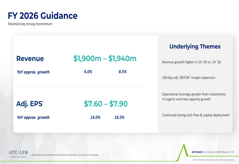 Adtalem maintained its full-year fiscal 2026 guidance, projecting revenue between $1,900 million and $1,940 million, representing year-over-year growth of 6.0% to 8.5%. Adjusted EPS is expected to range from $7.60 to $7.90, a 14.0% to 18.5% increase from fiscal 2025.