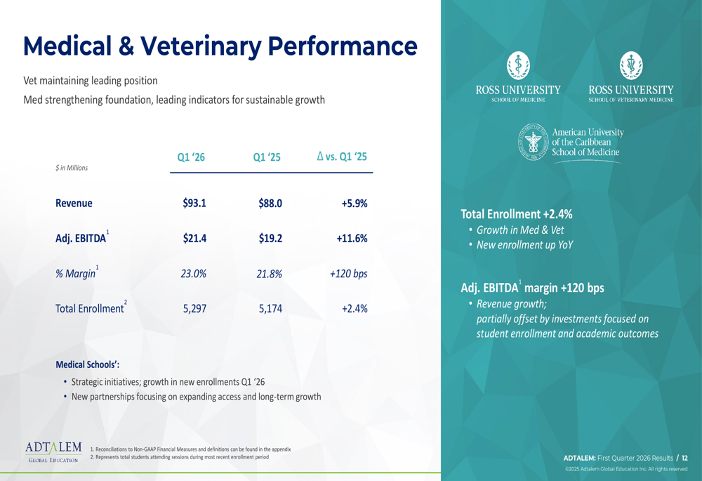 The Medical & Veterinary segment, which includes Ross University School of Medicine, Ross University School of Veterinary Medicine, and American University of the Caribbean School of Medicine, reported a 5.9% revenue increase to $93.1 million. Adjusted EBITDA grew 11.6% to $21.4 million, with the margin expanding by 120 basis points to 23.0%. Total enrollment increased 2.4% to 5,297 students.