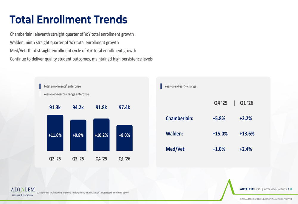 Total enrollment across all Adtalem institutions reached 97,359 students, an 8.0% increase year-over-year. This marks the ninth consecutive quarter of enrollment growth for the company, demonstrating the effectiveness of its "Growth with Purpose" strategy focused on marketing, enrollment, retention, pricing, and program development.