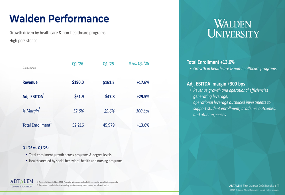 Walden University demonstrated the strongest performance among Adtalem’s segments, with revenue increasing 17.6% to $190.0 million and adjusted EBITDA growing 29.5% to $61.9 million. Total enrollment surged 13.6% to 52,216 students, representing the ninth consecutive quarter of year-over-year growth. The adjusted EBITDA margin expanded by 300 basis points to 32.6%.