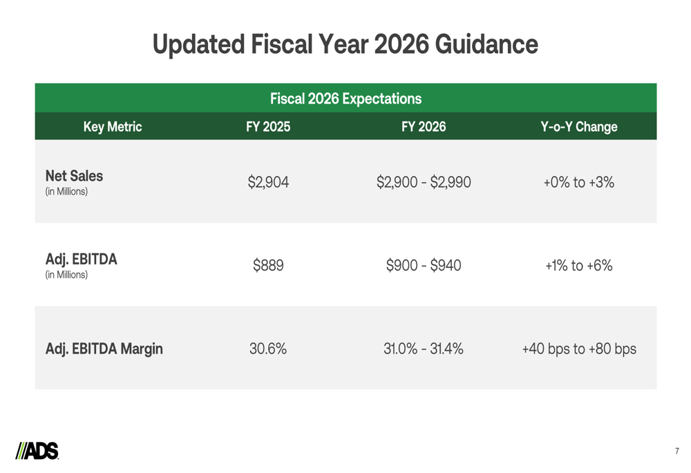 ADS maintained its full-year guidance with slight adjustments, projecting net sales of $2.900-$2.990 billion (0% to +3% growth) and adjusted EBITDA of $900-$940 million (+1% to +6% growth). The adjusted EBITDA margin is expected to improve by 40 to 80 basis points to 31.0%-31.4%.