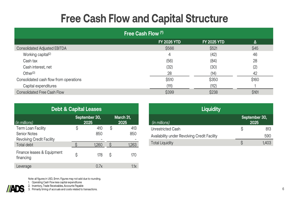 ADS demonstrated strong cash generation capabilities, with consolidated free cash flow reaching $399 million year-to-date, a substantial $161 million increase from the prior year. This improvement reflects both higher profitability and effective working capital management.