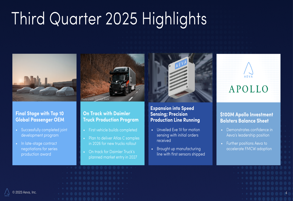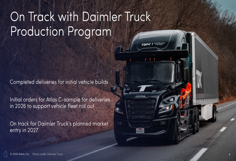 Simultaneously, Aeva continues to advance its partnership with Daimler Truck, having completed initial vehicle builds and remaining on track for Daimler's planned market entry in 2027. The company expects to deliver Atlas C samples in 2026 to support the vehicle fleet rollout.