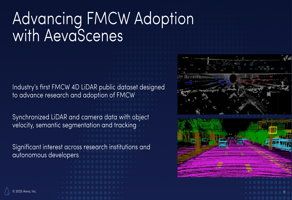 The company is also advancing FMCW adoption through AevaScenes, described as the industry's first FMCW 4D LiDAR public dataset. This initiative aims to accelerate research and adoption of the technology by providing synchronized LiDAR and camera data with object velocity, semantic segmentation, and tracking capabilities.