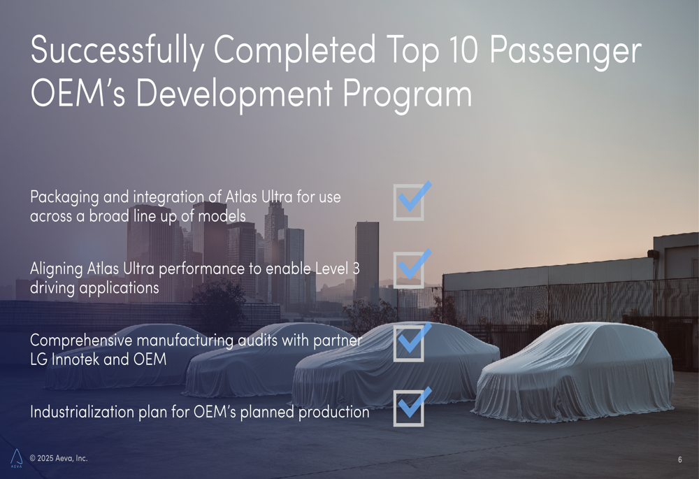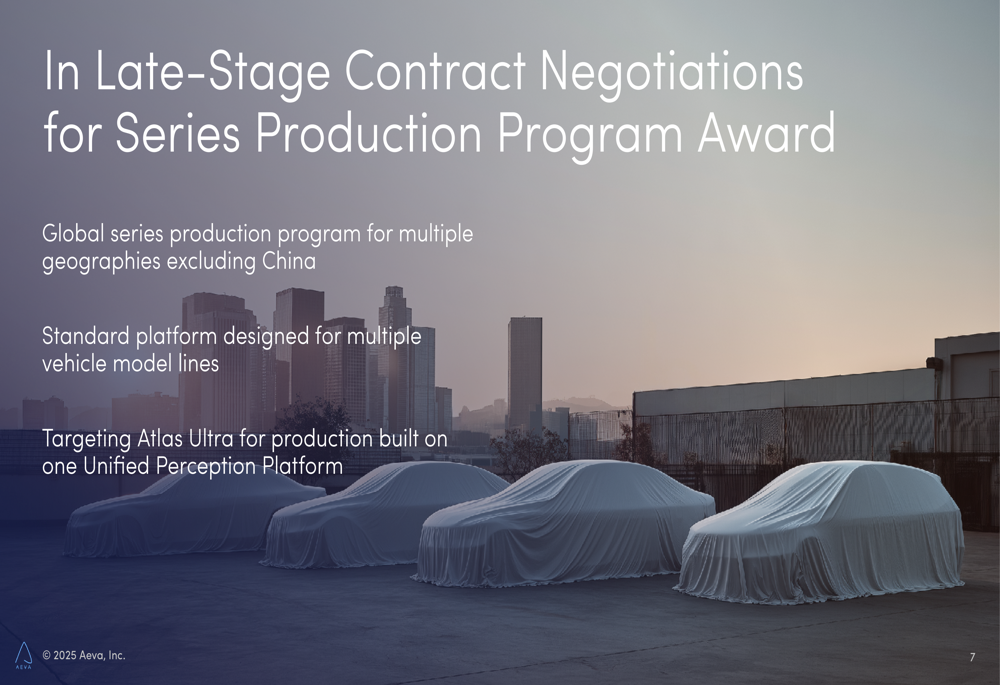 Aeva made substantial progress with automotive partners during the quarter, completing a joint development program with a top 10 global passenger OEM. The company is now in late-stage contract negotiations for a series production award that would integrate its Atlas Ultra technology across multiple vehicle model lines.