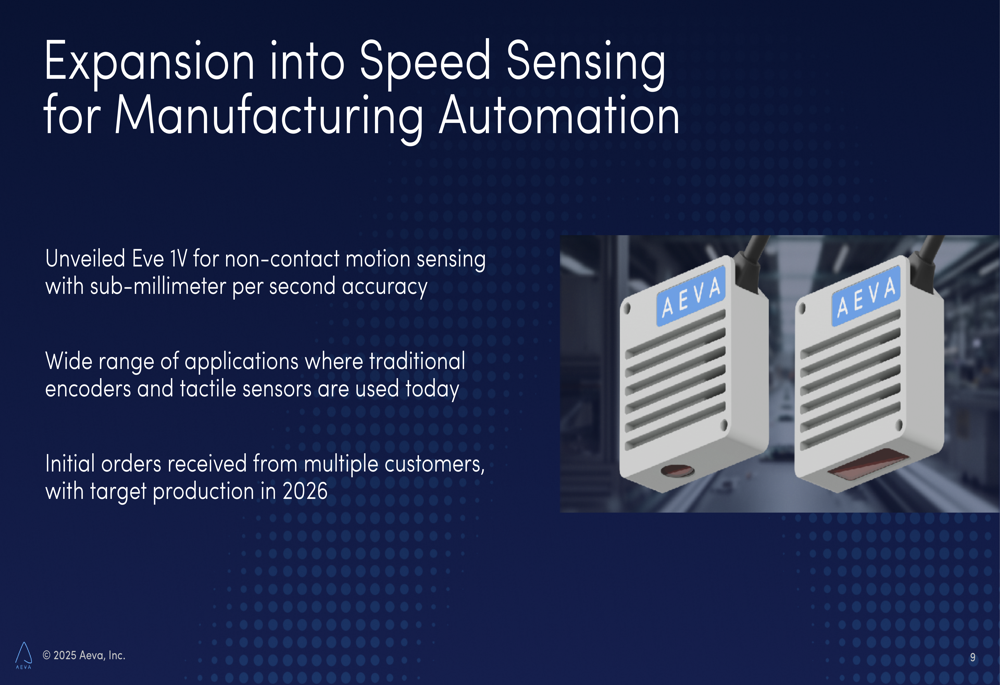 Beyond automotive applications, Aeva is expanding into manufacturing automation with its new Eve 1V product for non-contact motion sensing. This strategic diversification targets applications currently served by traditional encoders and tactile sensors, with initial orders already received from multiple customers.