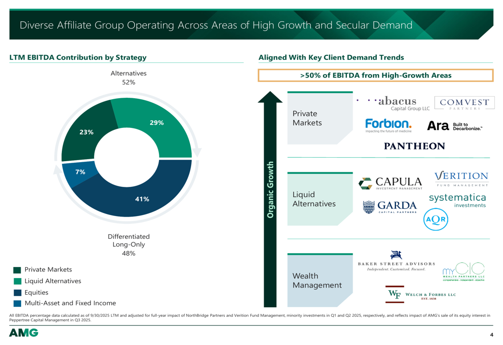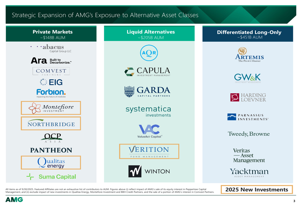 AMG’s presentation highlighted its strategic expansion into alternative asset classes, which has become central to its growth strategy. The company has diversified its exposure across Private Markets (~$148B AUM), Liquid Alternatives (~$205B AUM), and Differentiated Long-Only strategies (~$451B AUM).