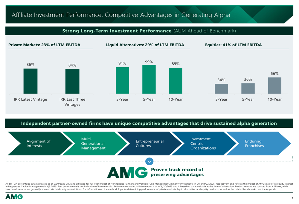 Notably, in Liquid Alternatives, which represent 29% of AMG’s LTM EBITDA, 91% of AUM outperformed benchmarks over a 3-year period, 99% over 5 years, and 89% over 10 years. Private Markets, contributing 23% of EBITDA, showed 86% of IRR outperforming in the latest vintage and 84% in the last three vintages.