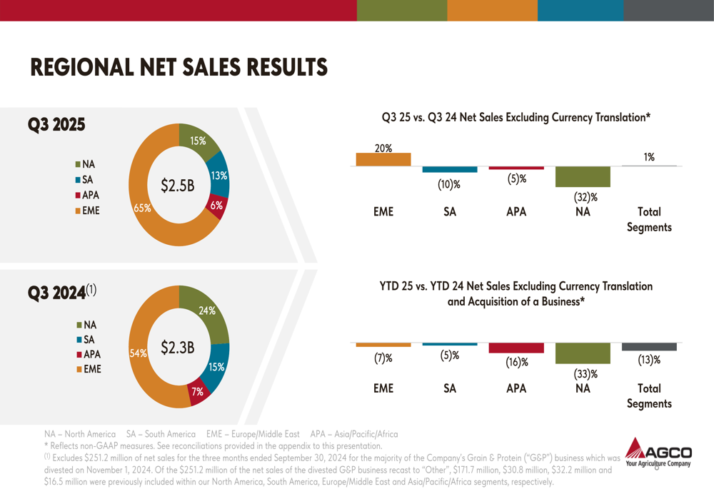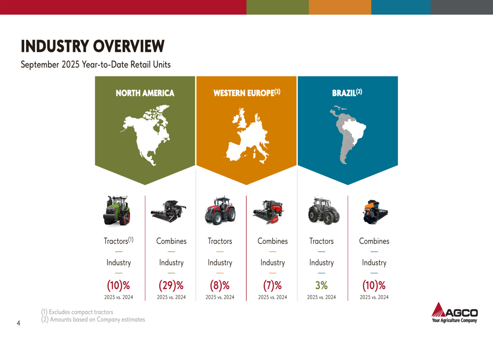 Industry data presented by AGCO revealed broad market challenges, with tractor and combine sales declining in most regions through September 2025. North American tractor industry sales fell 10%, while combine sales dropped 29%. Western European markets showed similar weakness with tractor sales down 8% and combine sales down 7%. Brazil offered a small bright spot with tractor sales increasing 3%, though combine sales still declined 10%.