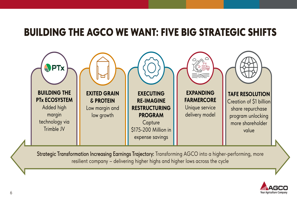 AGCO’s presentation emphasized five strategic shifts designed to transform the company into a higher-performing, more resilient organization. These initiatives include building the PTx technology ecosystem, exiting the low-margin Grain & Protein segment, executing the RE-IMAGINE restructuring program, expanding the FARMERCORE service model, and resolving TAFE ownership issues.