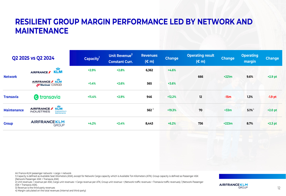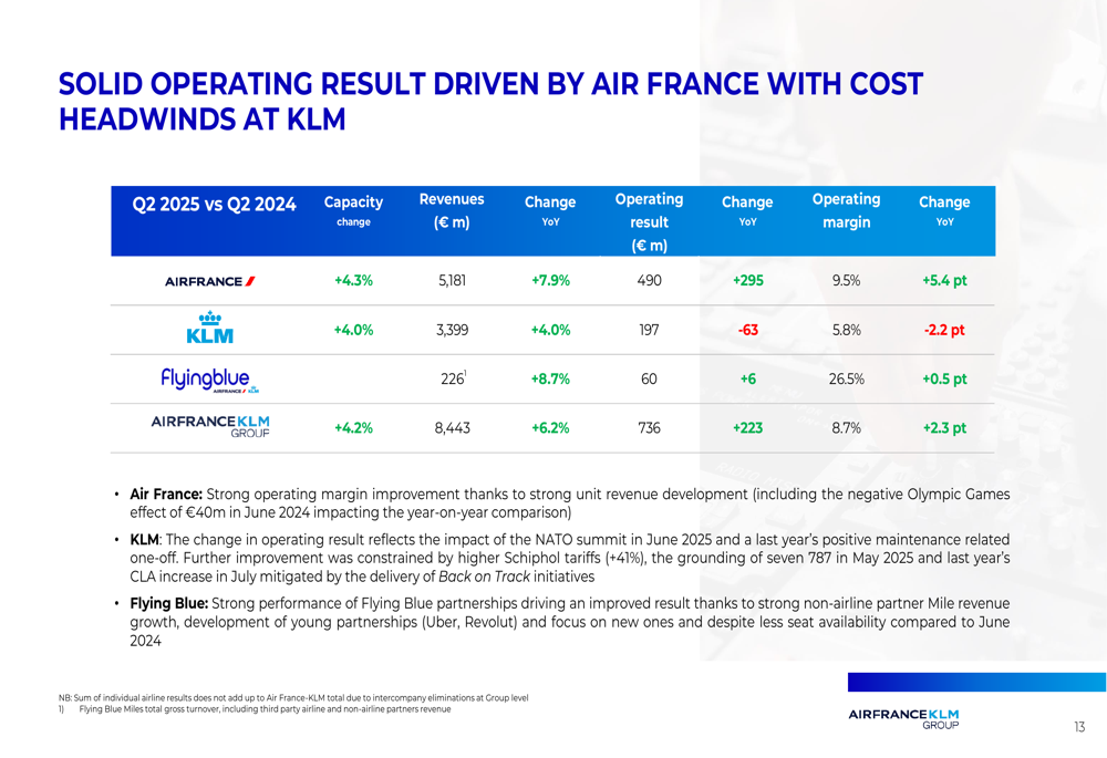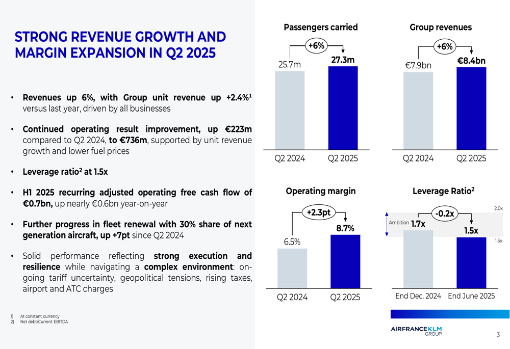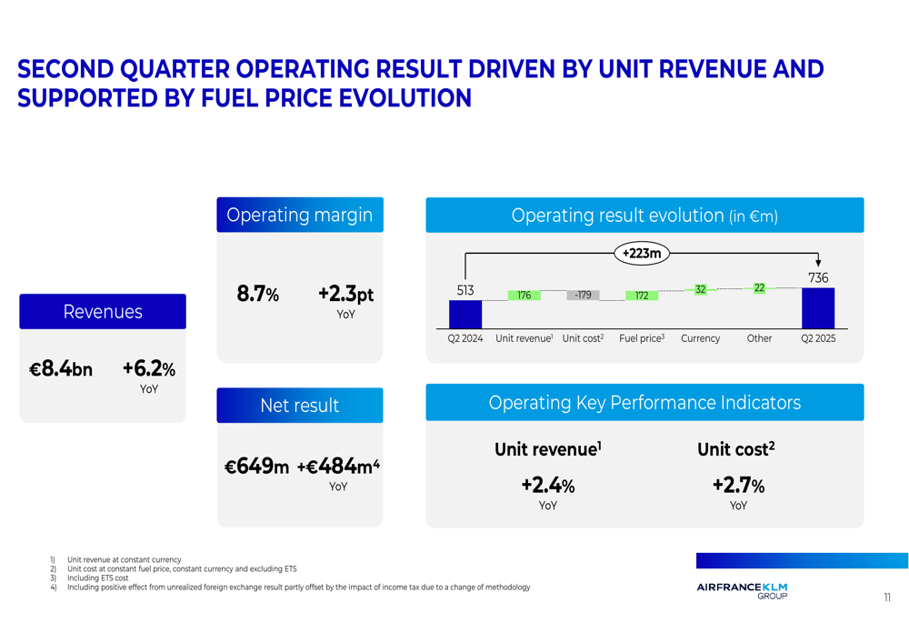 Air France-KLM reported revenues of €8.4 billion in Q2 2025, up 6.2% year-over-year, while the operating result improved by €223 million to reach €736 million. This translated to an operating margin of 8.7%, representing a significant 2.3 percentage point improvement from Q2 2024.