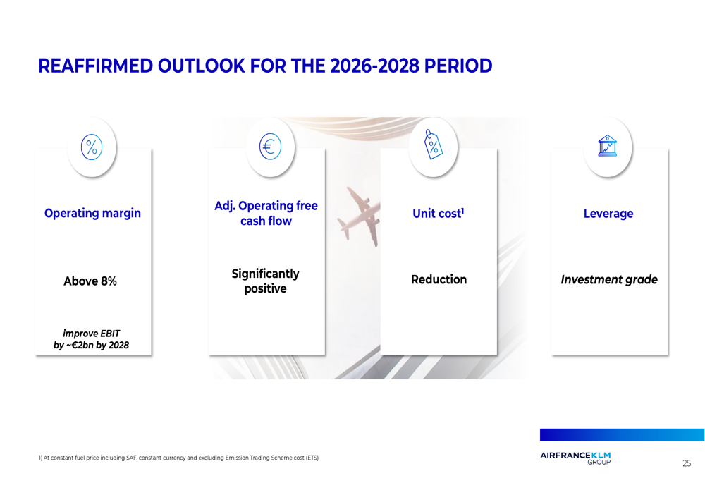 Notably, Air France significantly outperformed KLM in the quarter. Air France achieved a 9.5% operating margin (up 5.4 percentage points), while KLM’s margin declined to 5.8% (down 2.2 percentage points) due to cost headwinds. The Flying Blue loyalty program continued to deliver strong profitability with a 26.5% operating margin.