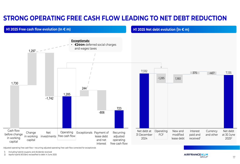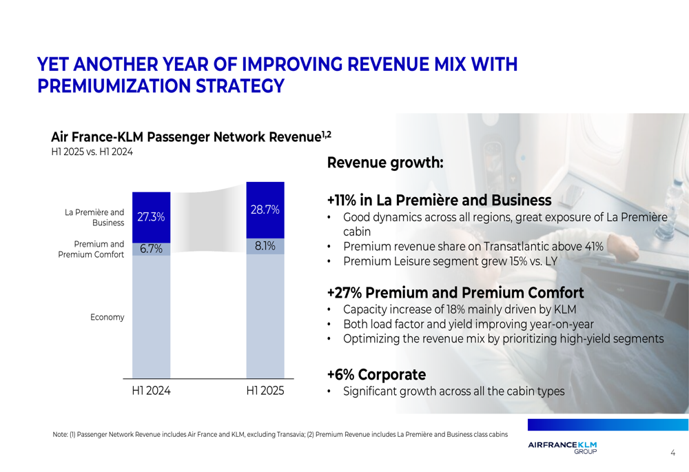 Air France-KLM’s premiumization strategy continues to gain traction, with La Premiere and Business class revenue increasing to 28.7% of passenger network revenue (up from 27.3% in H1 2024), while Premium and Premium Comfort classes grew to 8.1% (from 6.7%). This shift toward higher-yielding segments is helping drive revenue growth and margin expansion.