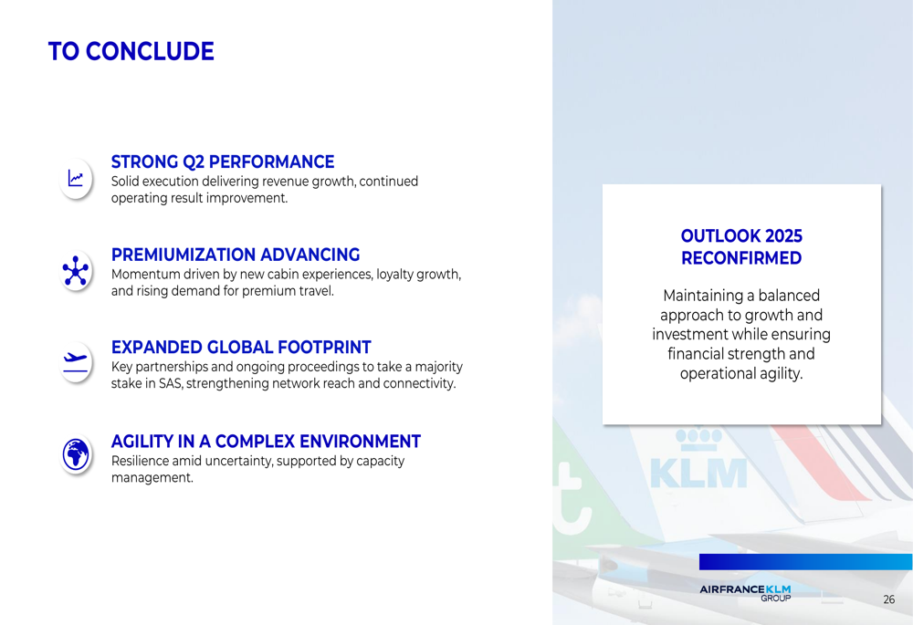 In conclusion, Air France-KLM’s Q2 2025 results demonstrate the company’s progress in implementing its strategic priorities while navigating a complex operating environment. The successful premiumization strategy, expanding global footprint, and focus on financial discipline have contributed to strong performance, particularly at Air France, though challenges remain at KLM. As the group continues to balance growth with investment, it appears well-positioned to achieve its medium-term financial targets.