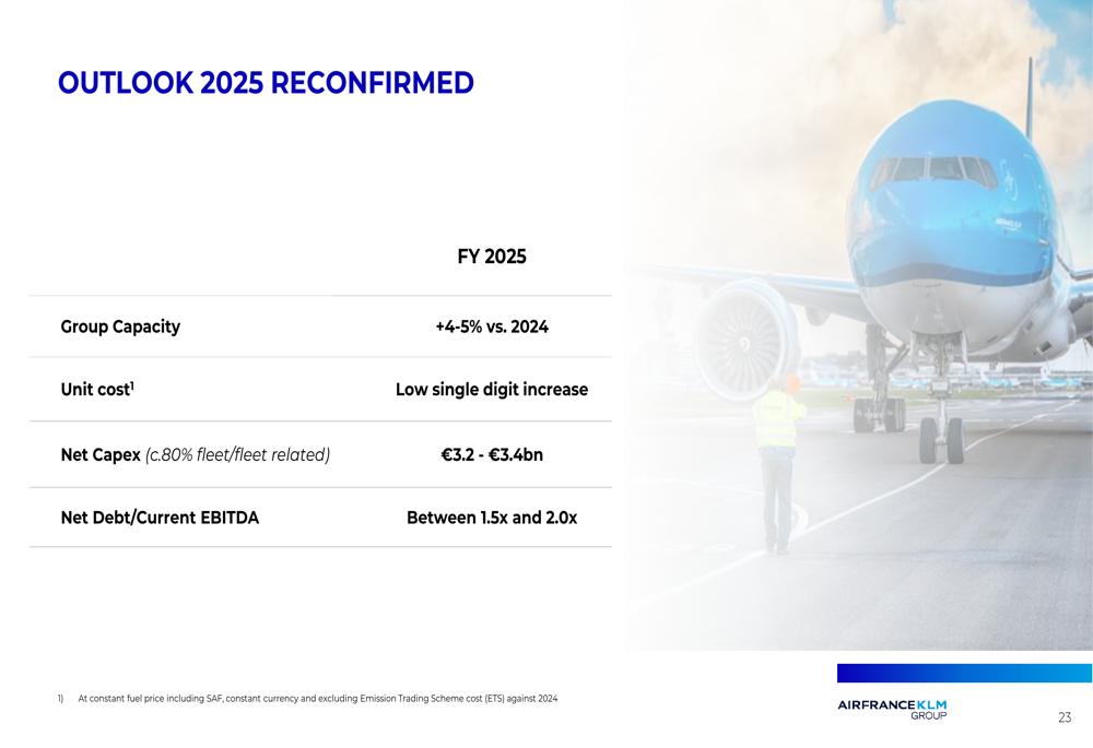 Air France-KLM reconfirmed its outlook for 2025, maintaining guidance for capacity growth of 4-5% compared to 2024, with unit costs expected to increase in the low single digits. Capital expenditures are projected at €3.2-3.4 billion, with approximately 80% allocated to fleet and fleet-related investments.