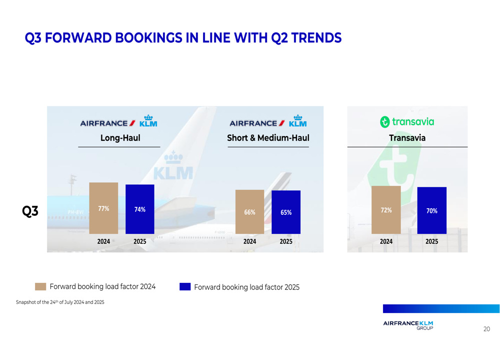 For the third quarter, forward bookings are slightly below last year’s levels but remain in line with Q2 trends. Long-haul bookings stand at 74% (versus 77% last year), while Short & Medium-Haul and Transavia bookings are at 65% and 70% respectively (compared to 66% and 72% in 2024).