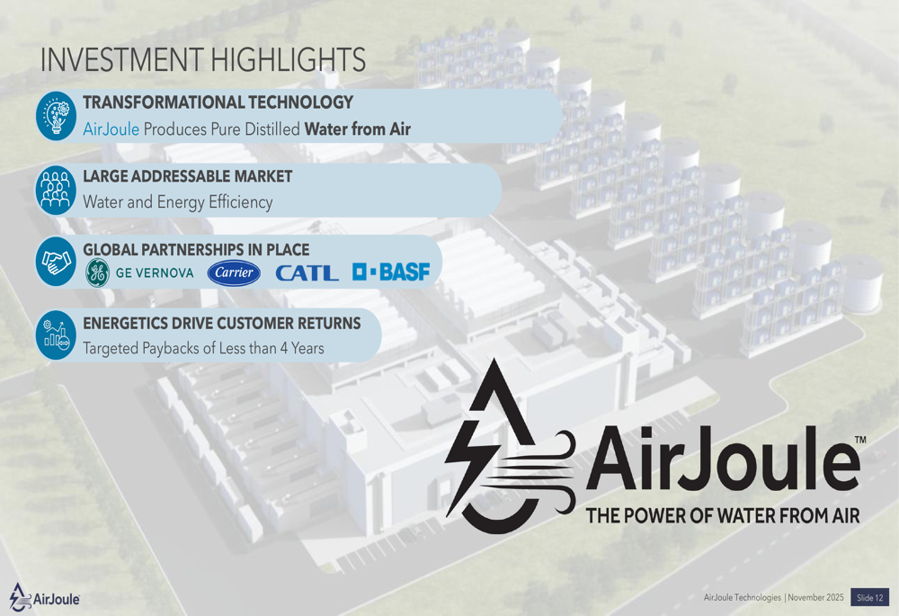 Looking ahead, AirJoule emphasized its investment potential through four key points: transformational technology that produces pure distilled water from air, a large addressable market focused on water and energy efficiency, global partnerships with industry leaders, and economics that drive customer returns with targeted paybacks under four years.
