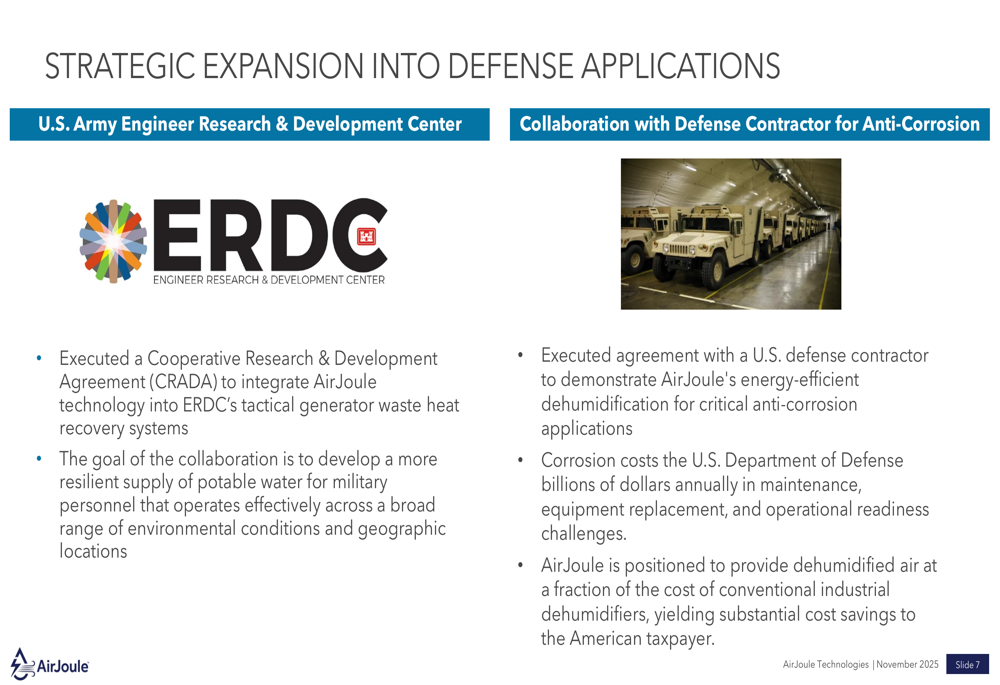 Particularly notable is AirJoule's expansion into defense applications through a Cooperative Research & Development Agreement (CRADA) with the U.S. Army Engineer Research & Development Center (ERDC). This partnership aims to integrate AirJoule's technology into tactical generator waste heat recovery systems to provide resilient potable water for military personnel.