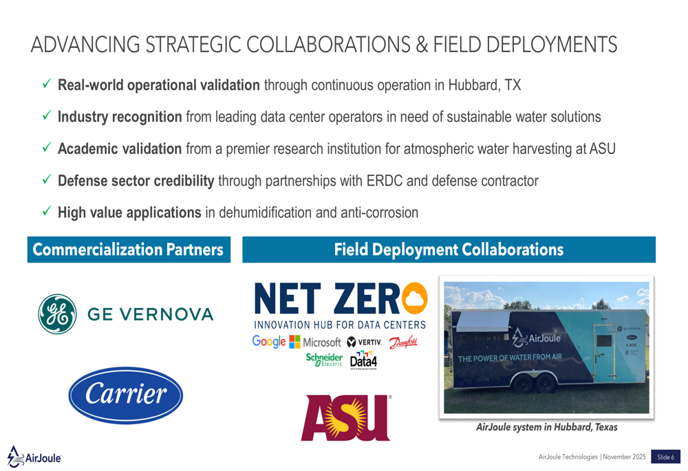 The following slide illustrates AirJoule's strategic collaborations and field deployments: