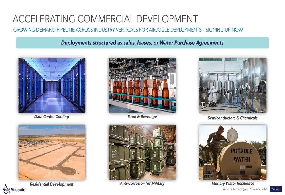 AirJoule is pursuing commercial development across multiple verticals, offering its technology through various business models including direct sales, leases, and newly introduced Water Purchase Agreements. These agreements allow customers to pay for water produced rather than purchasing equipment outright, potentially lowering barriers to adoption.