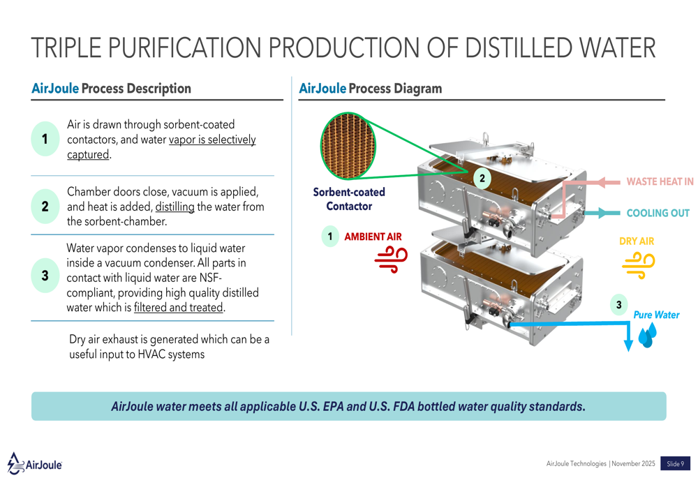 AirJoule's core technology produces distilled water from air through a triple purification process. The company claims its water meets all applicable U.S. EPA and FDA bottled water quality standards, positioning it as a high-quality solution for various applications.