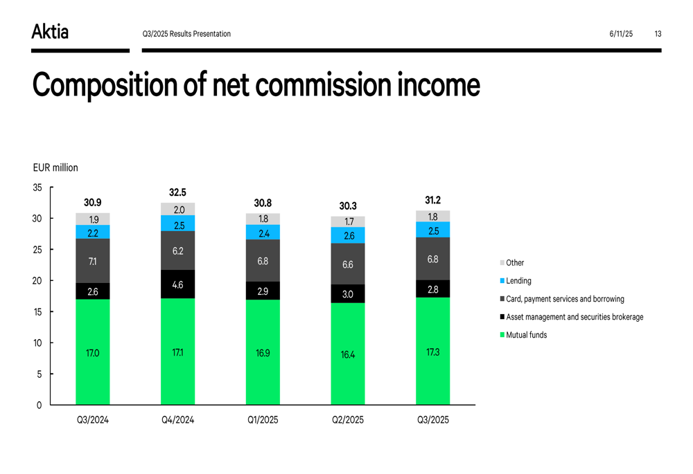 Meanwhile, net commission income showed resilience, increasing slightly to EUR 31.2 million from EUR 30.9 million in Q3 2024. The breakdown of commission income reveals the importance of mutual funds to Aktia's business model:
