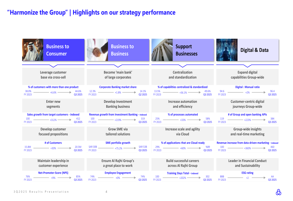 Al Rajhi Bank’s "Harmonize the Group" strategy continues to show tangible results across four key business areas. The percentage of customers with more than one product increased from 38.0% in FY 2023 to 44.6% in Q3 2025, demonstrating success in cross-selling efforts. Meanwhile, the bank’s Corporate Banking market share expanded from 12.3% to 14.1%.