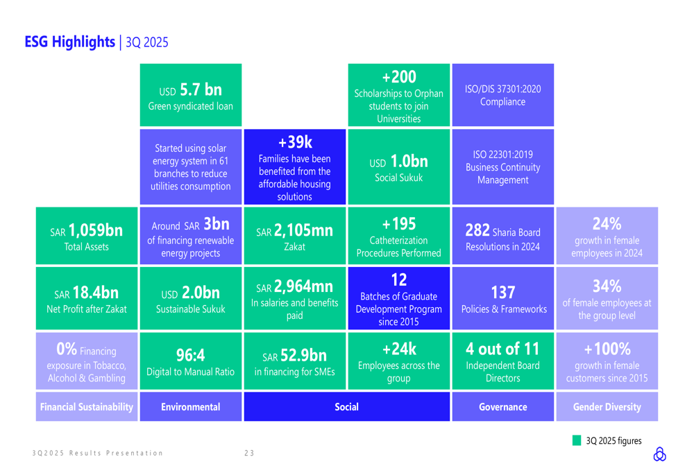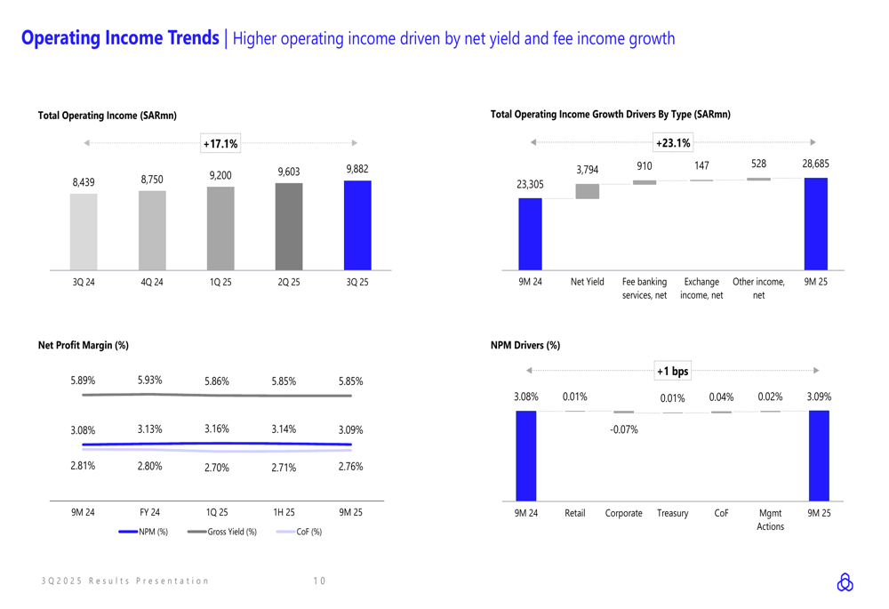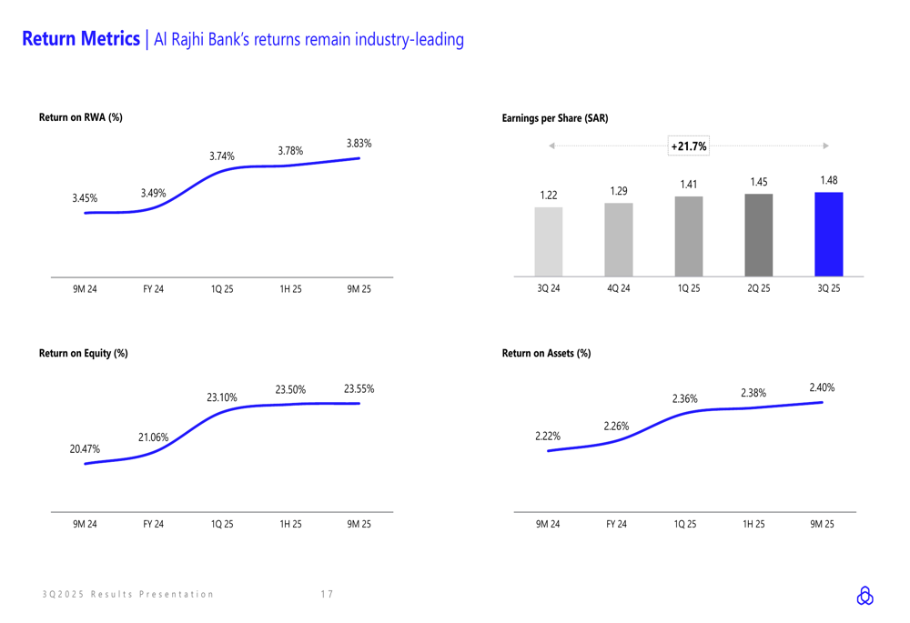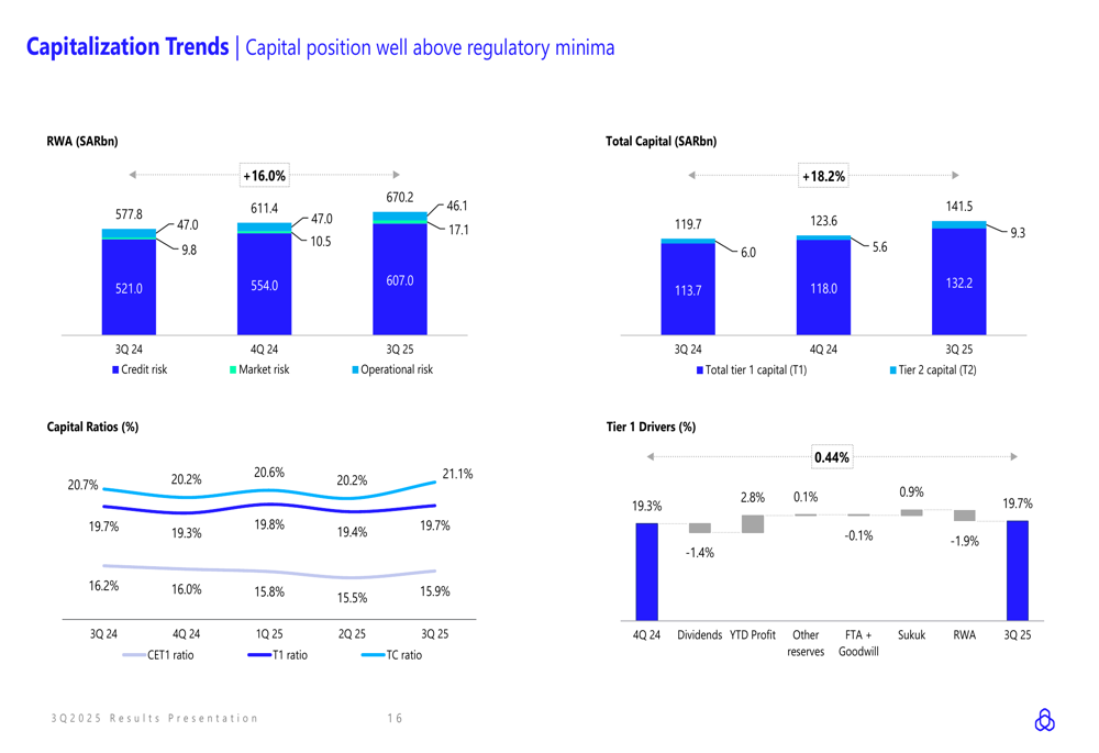 The bank’s return metrics remain industry-leading, with return on equity (ROE) improving to 23.55% for the first nine months of 2025, up from 20.47% in the same period last year. Earnings per share increased to SAR 1.48 in Q3 2025 from SAR 1.22 in Q3 2024.