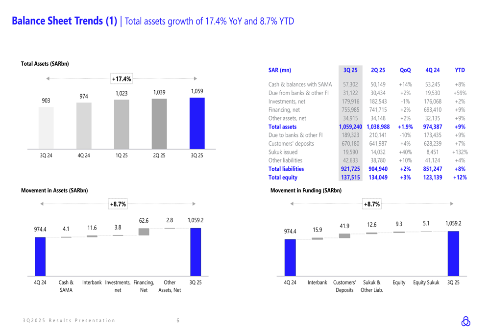 Total assets grew by 17.4% year-over-year and 8.7% year-to-date, reaching SAR 1,059 billion by the end of Q3 2025. This growth was primarily driven by a 9.0% year-to-date increase in the financing portfolio, which reached SAR 756.0 billion, up from SAR 693.4 billion at the end of 2024.