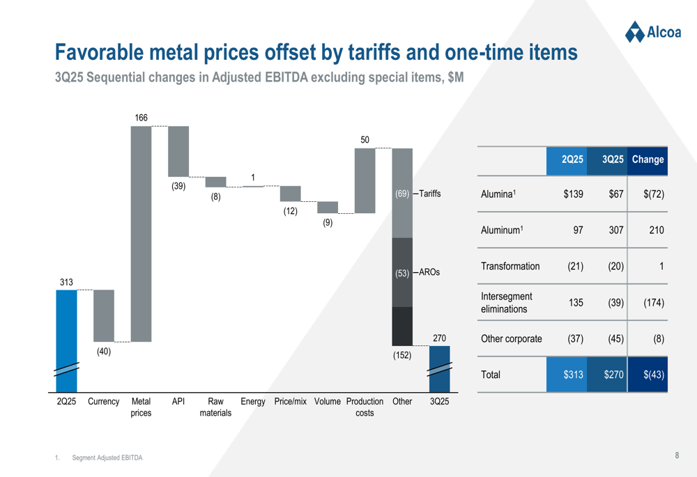 Adjusted EBITDA declined to $270 million in the third quarter from $313 million in the second quarter. This decrease was primarily driven by the divergent performance of Alcoa’s two main segments: Aluminum showed strong improvement with $307 million in Adjusted EBITDA (up from $97 million), while the Alumina segment declined sharply to $67 million (down from $139 million).