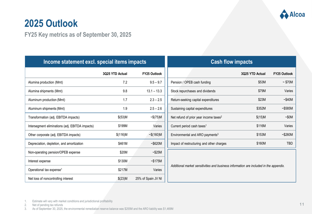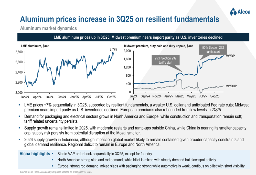 Alcoa’s third-quarter 2025 presentation reflects a company navigating mixed market conditions while implementing significant strategic changes. Despite the earnings miss and stock price decline, the company maintains a strong financial position with opportunities for improvement in the coming quarters.