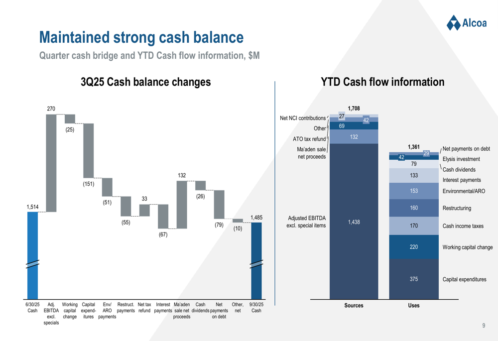 Alcoa maintained a strong cash position of $1.485 billion at the end of the quarter, slightly down from $1.514 billion on June 30. The company’s financial position continues to benefit from operational cash flow, though this was partially offset by capital expenditures and other items.