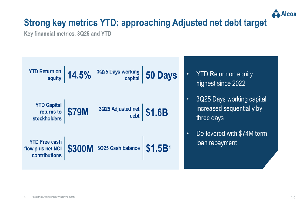 Despite the quarterly challenges, Alcoa highlighted several positive year-to-date metrics, including a 14.5% return on equity, which the company noted was the highest since 2022. The company also maintained its focus on shareholder returns, with $79 million in capital returned to stockholders year-to-date.