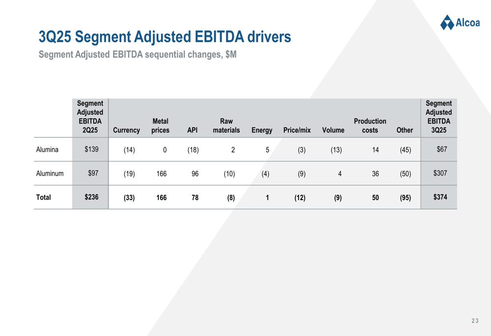 A deeper dive into segment performance reveals the key drivers behind the changes in Adjusted EBITDA. The Aluminum segment benefited significantly from higher metal prices and improved production costs, while the Alumina segment faced challenges from lower pricing and higher costs.