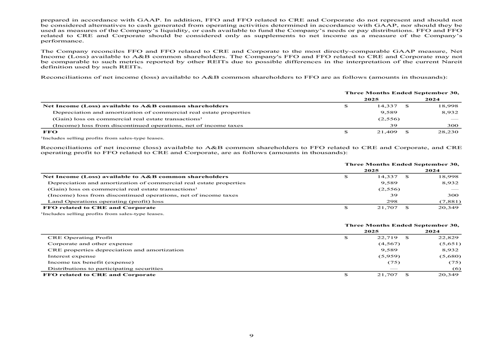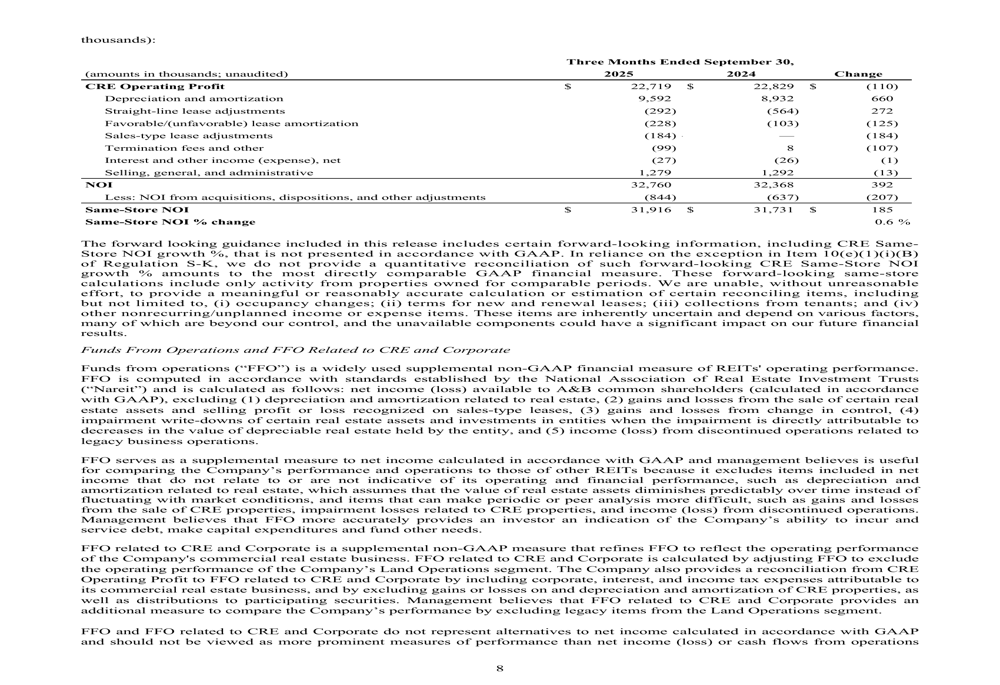 Commercial Real Estate (CRE) operating profit reached $22.7 million for the quarter, while Funds From Operations (FFO) totaled $21.4 million, or $0.29 per diluted share. FFO specifically related to CRE and Corporate operations improved to $21.7 million, or $0.30 per diluted share, up from $0.28 in the prior year period.