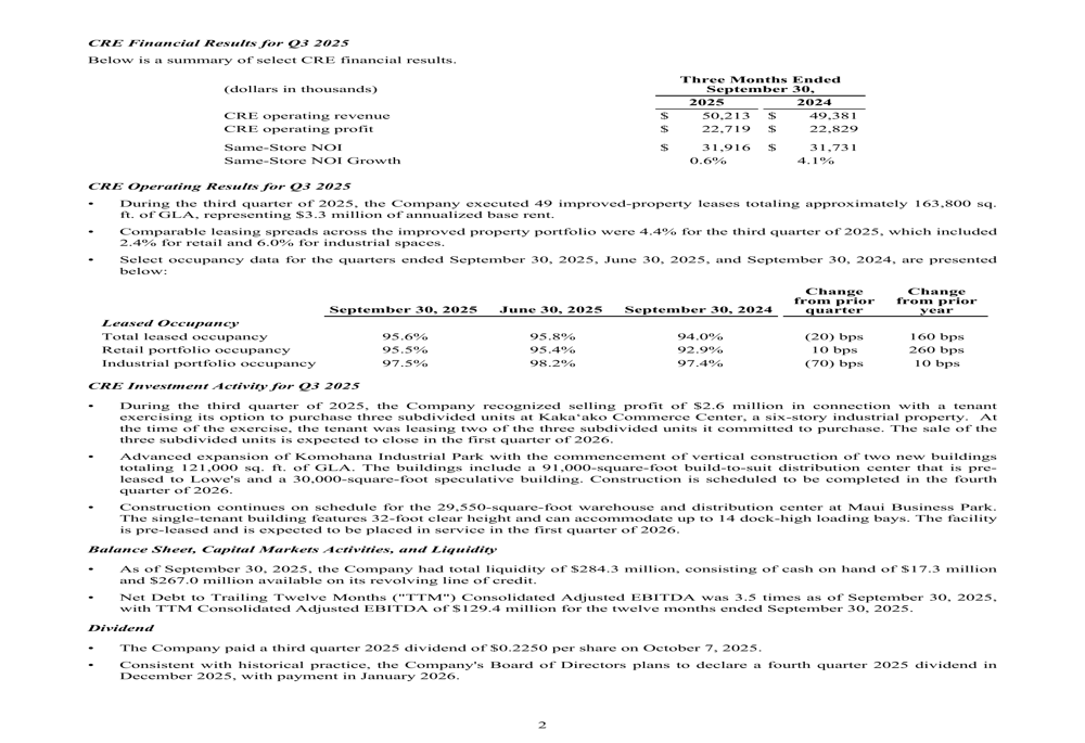 The company also capitalized on value creation opportunities, recognizing a $2.6 million selling profit when a tenant exercised its option to purchase three subdivided units at Kakaʻako Commerce Center.