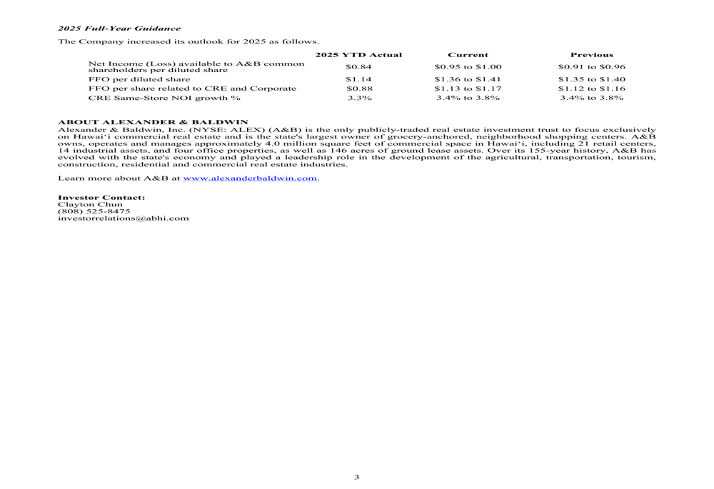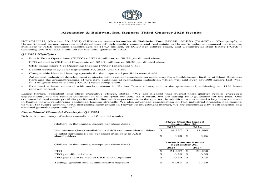 Based on strong performance through the first three quarters, Alexander & Baldwin raised its full-year 2025 guidance across multiple metrics. The company now expects net income available to common shareholders of $0.95 to $1.00 per diluted share, up from previous guidance of $0.91 to $0.96.