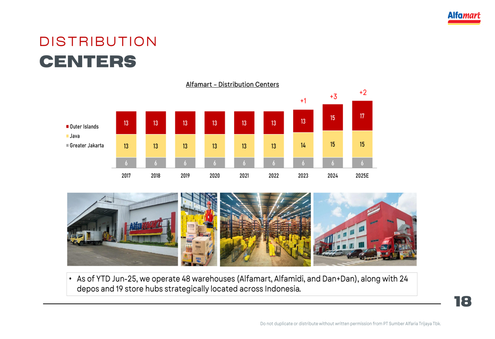 To support its growing store network, Alfamart has expanded its distribution infrastructure to include 48 warehouses (serving Alfamart, Alfamidi, and Dan+Dan), 24 depos, and 19 store hubs strategically located across Indonesia. The company plans to continue expanding its distribution center network to enhance supply chain efficiency and drive long-term operating expense optimization.