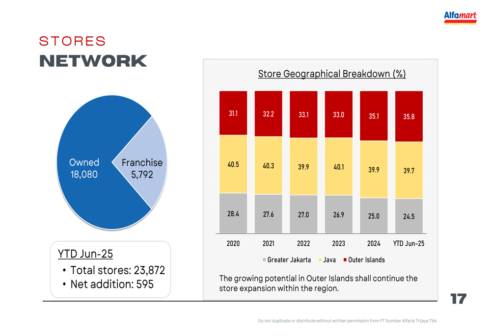 Alfamart continues to expand its store network, which reached 23,872 total stores as of June 2025, consisting of 18,080 owned stores and 5,792 franchise locations. The company added a net of 595 new stores during the period, with a geographical focus on Greater Jakarta (35.8% of total stores) and Java (39.7%), though management noted the "growing potential in Outer Islands" for future expansion.