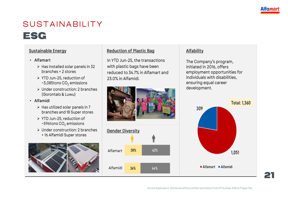 Alfamart has implemented several Environmental, Social, and Governance (ESG) initiatives. On the environmental front, the company has installed solar panels in 32 branches and 2 stores, resulting in a reduction of approximately 3,085 tons of CO2 emissions year-to-date. Its Alfamidi brand has also deployed solar panels in 7 branches and 18 Super stores, reducing emissions by about 596 tons.