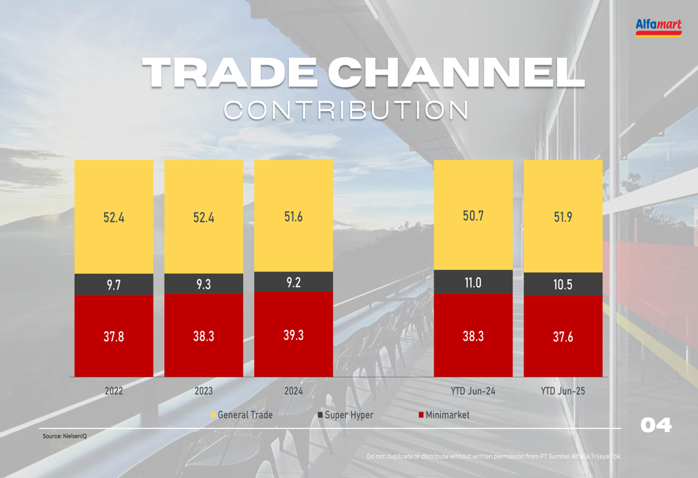 The presentation highlighted the continued importance of minimarkets in Indonesia’s retail landscape, with the channel maintaining a 37.6% market share in the first half of 2025. While this represents a slight decrease from 38.3% in the same period last year, minimarkets continue to be a crucial retail channel alongside general trade (51.9%) and super/hyper markets (10.5%).