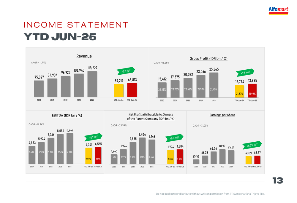 Alfamart reported strong financial results for the first half of 2025, with revenue reaching IDR 63,813 billion, a 7.8% increase compared to IDR 59,219 billion in 1H24. Gross profit grew at an even faster pace, up 9.5% year-over-year to IDR 13,985 billion, with gross profit margin expanding to 21.92% from 21.57% a year earlier.