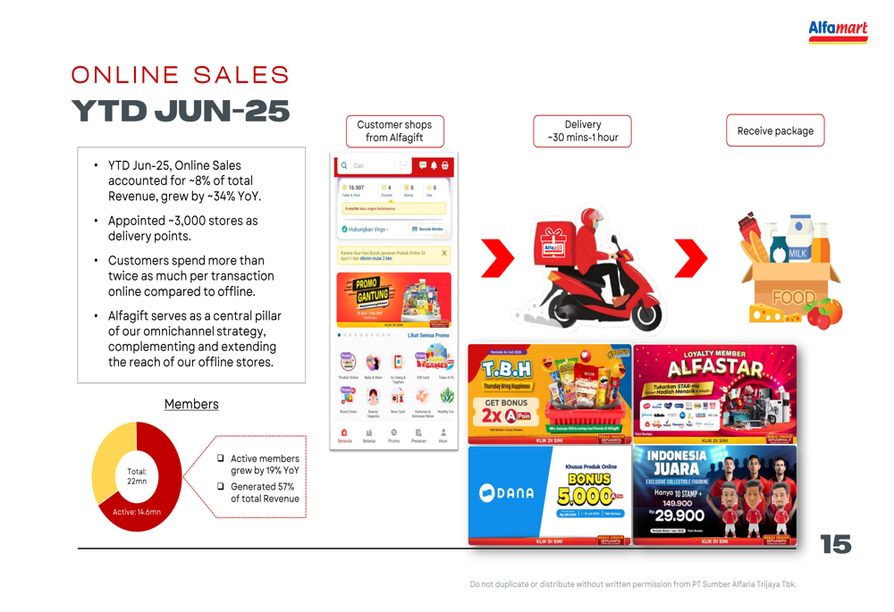 Alfamart’s digital transformation efforts are yielding significant results, with online sales now accounting for approximately 8% of total revenue and growing by around 34% year-over-year. The company has designated approximately 3,000 stores as delivery points to support its e-commerce operations.