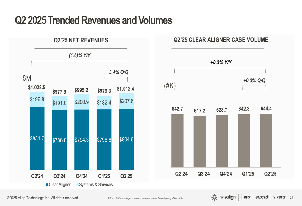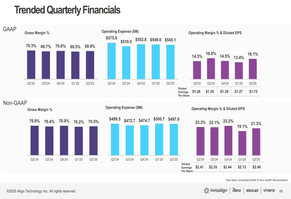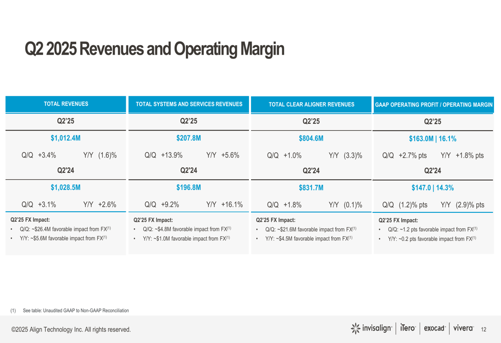 Align Technology reported total Q2 2025 revenues of $1,012.4 million, representing a 3.4% increase quarter-over-quarter but a 1.6% decrease year-over-year. The GAAP operating margin improved to 16.1%, up 2.7 percentage points sequentially and 1.8 percentage points year-over-year.