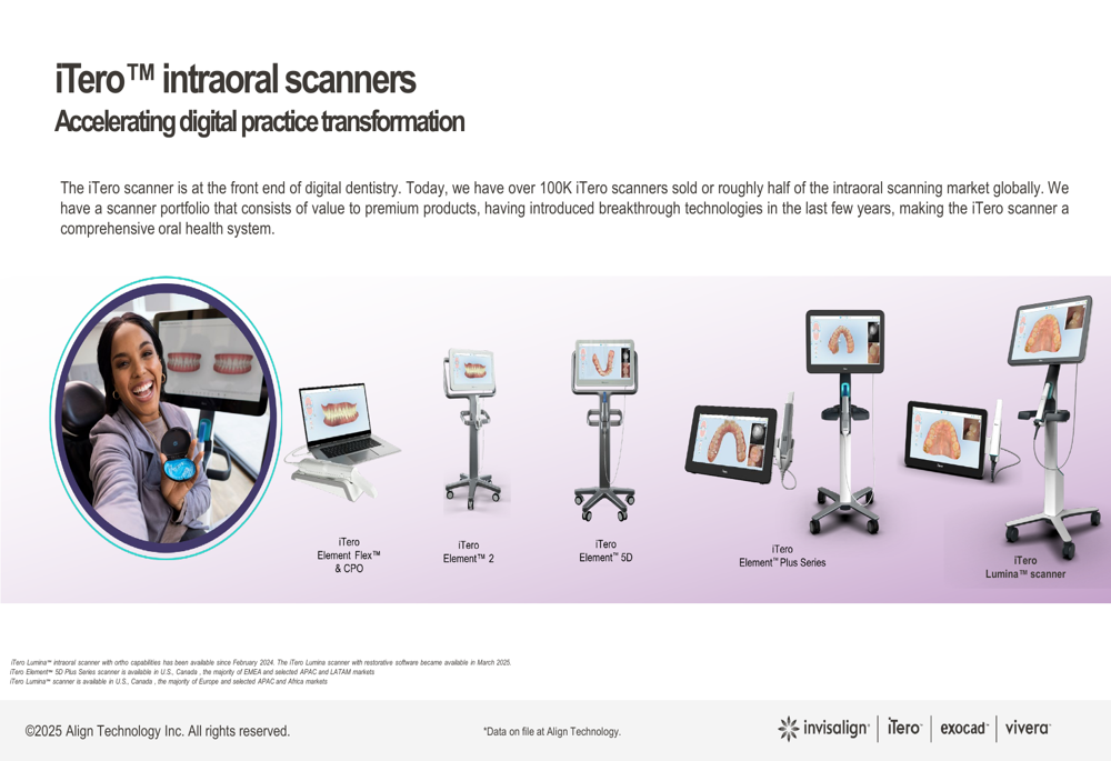 The company’s iTero scanner business remains a strategic priority, with over 100,000 scanners sold to date. Management positions the scanner as the entry point to digital dentistry, as shown in the following product lineup: