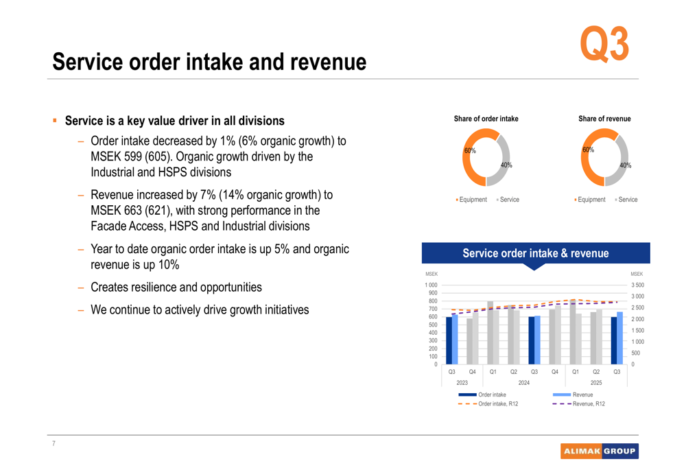 Service business continued to be a bright spot for Alimak, with service order intake growing 6% organically to MSEK 599 and service revenue increasing by an impressive 14% organically to MSEK 663. The company highlighted strong performance in the Facade Access, HSPS (Height Safety & Productivity Solutions), and Industrial divisions.