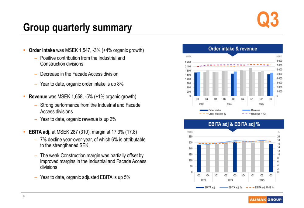 Alimak reported Q3 2025 order intake of MSEK 1,547, representing a 3% decline on a reported basis but 4% organic growth when adjusted for currency effects. Revenue reached MSEK 1,658, down 5% as reported but up 1% organically compared to the same period last year.