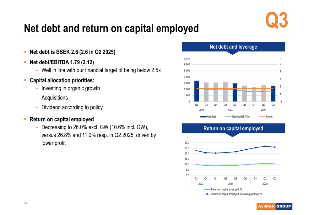 3. European restructuring: Alimak is implementing capacity reductions in Spain and Luxembourg, with two-thirds of the announced MSEK 60 restructuring cost incurred in Q3. The company expects MSEK 30 in recurring cost savings from the beginning of 2026.