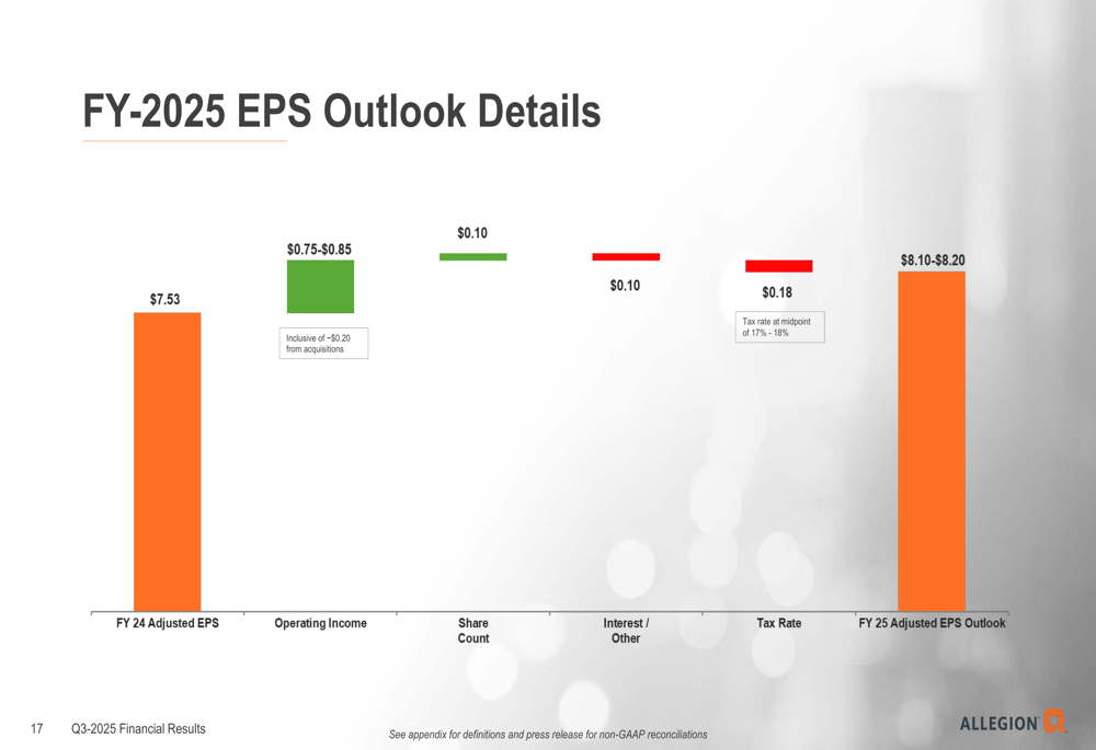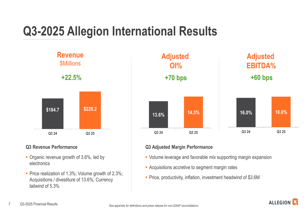 Allegion’s Q3 2025 results demonstrate the company’s ability to execute effectively in a challenging market environment. With double-digit revenue growth, strategic acquisitions, and an improved outlook, Allegion appears well-positioned to maintain its growth trajectory. The company’s focus on electronics products and international expansion, combined with disciplined capital allocation, provides multiple avenues for continued growth despite potential headwinds from inflation, tariffs, and soft residential markets.